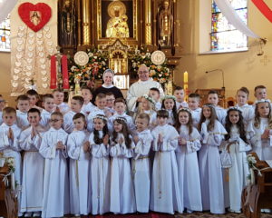 13 maja w naszym kościele parafialnym podczas Mszy św. o godz. 10.00, grupa 36 dzieci z naszej parafii po raz pierwszy przystąpiła do Sakramentu Eucharystii.